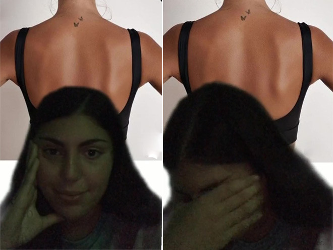Ở phần đầu của clip, người phụ nữ trẻ chèn vào một bức ảnh chụp hình xăm trong mơ của cô, có nghĩa là hai con bướm xinh xắn được xăm sau gáy với màu đen và trắng. Nhưng kết quả cuối cùng khiến cô kinh hoàng, thay vì những con bướm dễ thương, người nghệ sĩ đã tạo ra một thứ hoàn toàn khác - thực tế là khác, một số người nói rằng nó trông giống như một cặp răng trên lưng của cô.