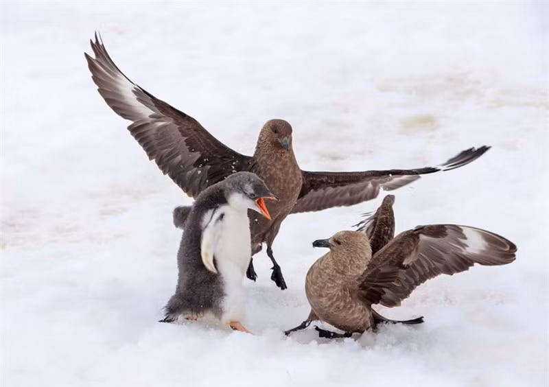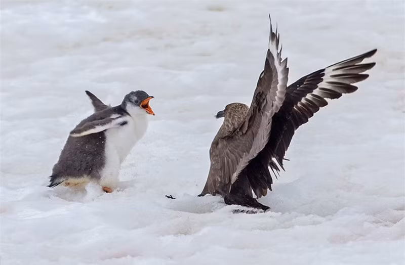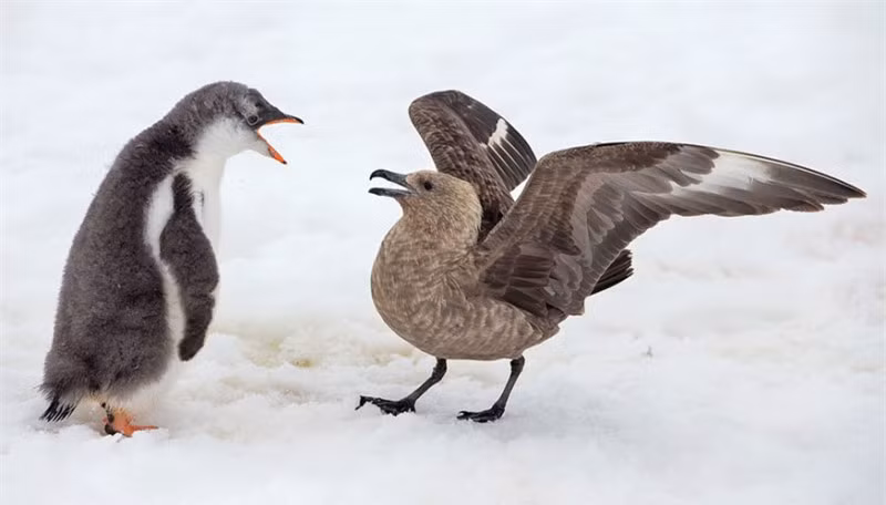 Đôi lúc, 2 con chim biển phải dè chừng trước sự dũng cảm của cánh cụt.