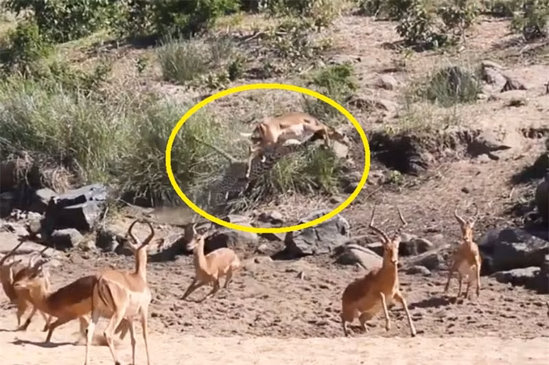 Ở đoạn video dưới đây, báo hoa mai đã mai phục sẵn trong bụi cây. Đến khi linh dương Impala chạy qua, báo đã phi thân tóm gọn con mồi một cách dễ dàng.