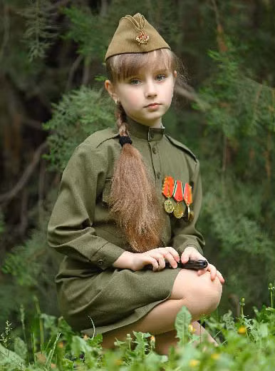 Nước da trắng hồng đặc trưng của những bé gái xứ sở bạch dương, đôi mắt to sáng, sống mũi cao thẳng và mái tóc nâu nhạt, cô bé xinh đẹp như thiên thần trong phục trang của một nữ quân nhân nhỏ bé.