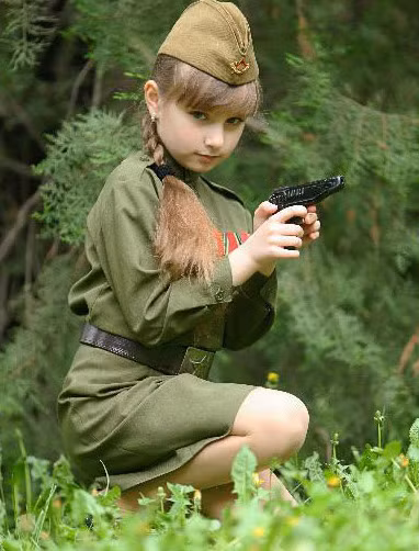 Cô bé Nga mặc quân phục... “ngắm bắn” đáng yêu