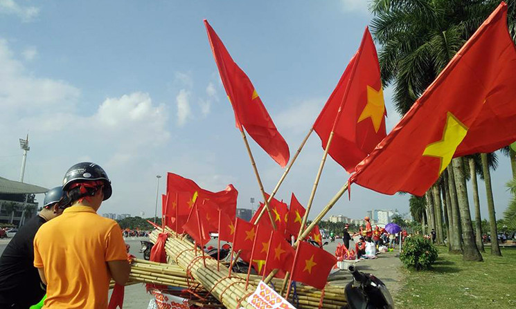 Trong khi đó, trên khắp các tuyến đường phố Hà Nội cờ đỏ sao vàng, kèn thổi được bày bán đỏ rực phục vụ người hâm mộ.