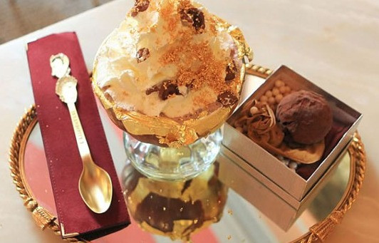Nếu bạn có 25.000 USD (gần 600 triệu VND) để ăn tiêu thỏa thích, thì bạn có thể thử món Frrrozen Haute Chocolate Ice Cream Sundae được tạo ra tại Serendipity 3 ở Thành phố New York. Món tráng miệng sang trọng này được làm từ kem với các thành phần bao gồm hỗn hợp cacao quý hiếm, nấm truffle, kem và sữa. Bên trong cây kem thậm chí còn có một viên kem dát vàng 23 karat. Nó được phục vụ trong một chiếc cốc vàng với một chiếc thìa vàng. Những thực khách đặt món tráng miệng trị giá 25.000 USD này còn được tặng một chiếc vòng tay bằng vàng 18 karat để làm kỷ niệm.