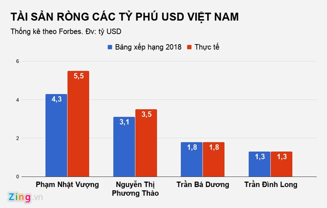 | Khối tài sản ròng và vị trí hiện tại của các tỷ phú USD Việt trên bảng xếp hạng của Tạp chí Forbes. |