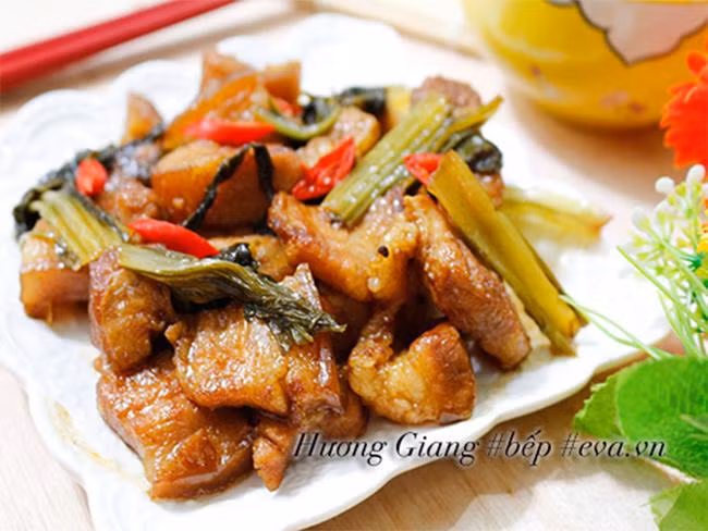 Tiếp đến bạn cho nước tương, muối, tiêu, bột nêm, ớt đảo đều cho thịt thấm gia vị rồi cho dưa chua lên trên. Thêm nước xâm xấp mặt thịt và kho cho đến khi thịt cạn nước là được.
