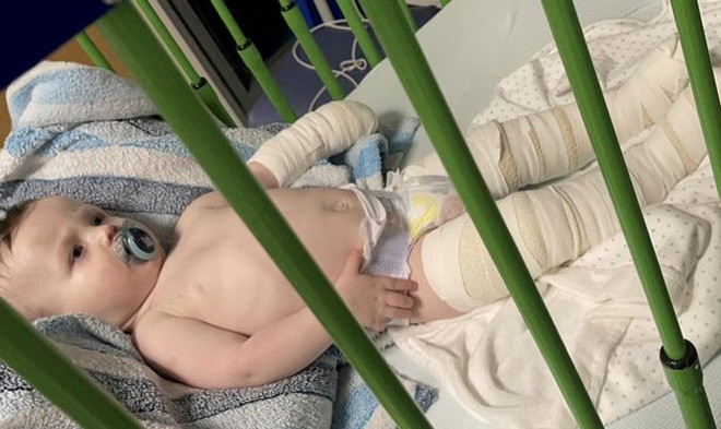 Cậu bé Blake Nilssen, 10 tháng tuổi đã bị bỏng độ 2 sau khi bị xô nước nóng có pha thuốc tẩy đổ vào người.