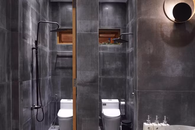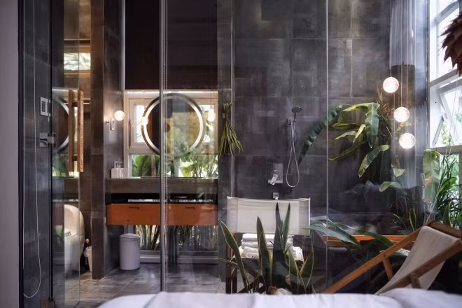 Không gian nhà tắm được trang trí thêm những chiếc đèn thả hình tròn và ô cửa thoáng rộng kết nối với bên ngoài.