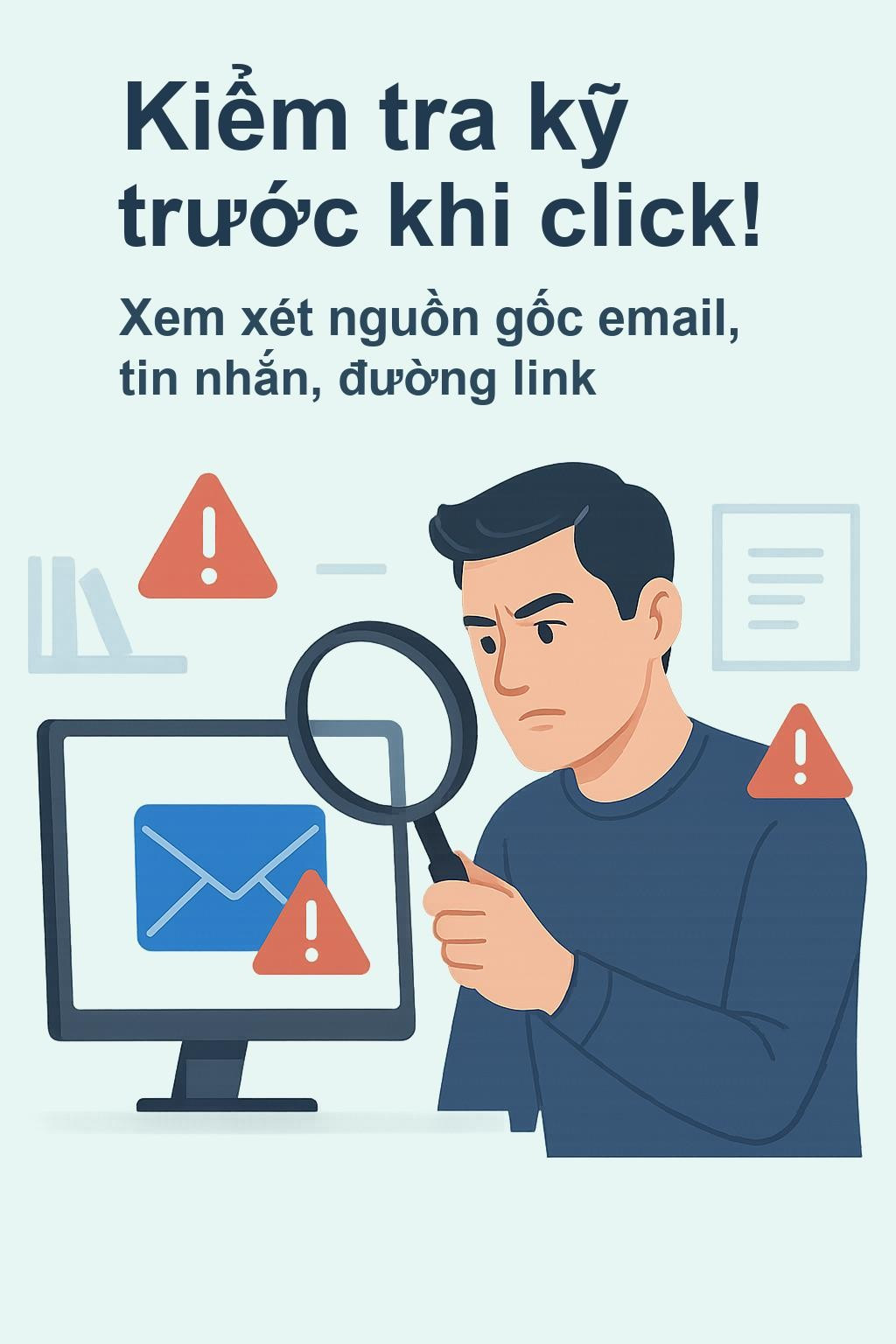 Kiểm tra kỹ lưỡng trước khi click: Luôn rà soát nguồn gốc của email, tin nhắn, đường link trước khi mở hoặc click vào. Nếu có bất kỳ dấu hiệu bất thường nào, hãy xóa bỏ ngay lập tức.