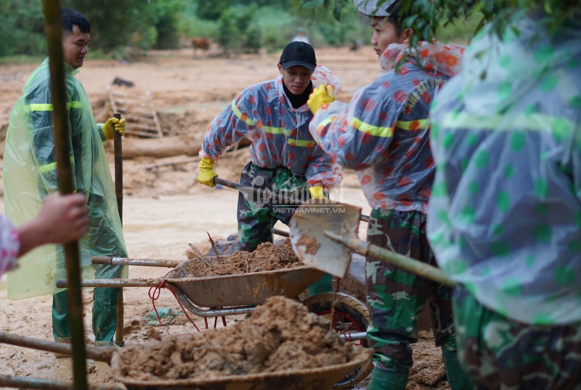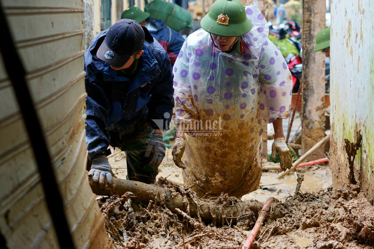 Cây gỗ, đất đá tràn xuống nhà dân được các chiến sĩ dọn dẹp.