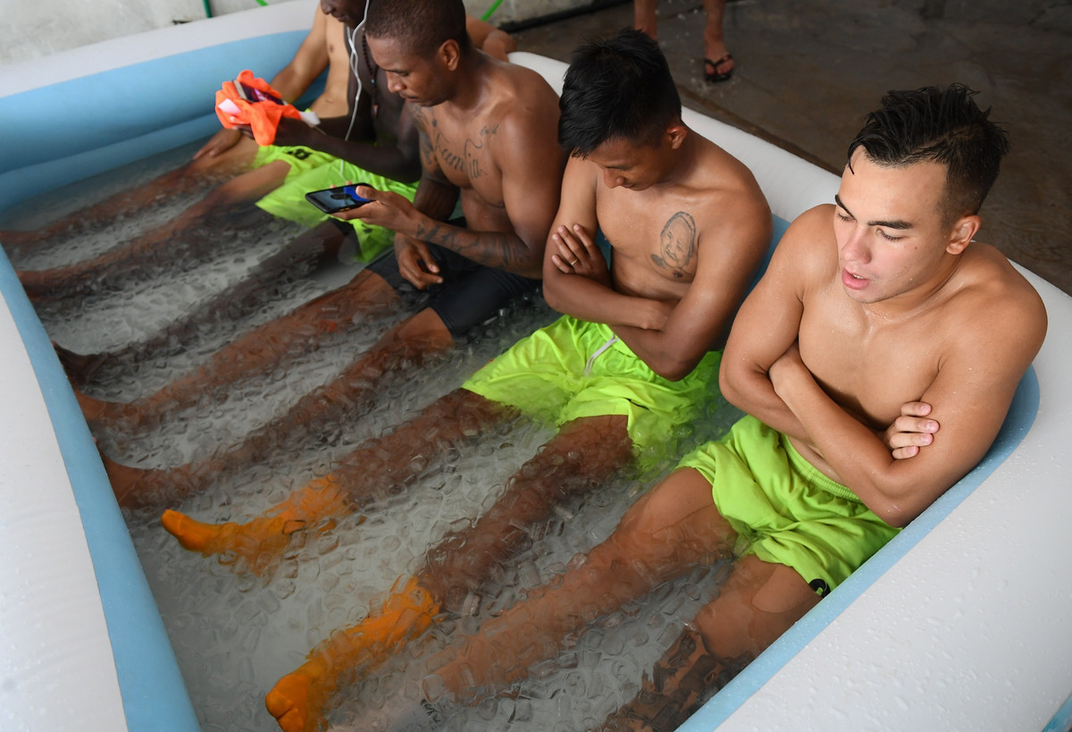 Khoảng 9h30, tôi cùng đồng đội đi ngâm nước đá. Đây là phương pháp thư giãn, phục hồi thể lực khoa học quen thuộc với các cầu thủ chuyên nghiệp, cũng là dịp tôi dành thời gian với các đồng đội trong nước.