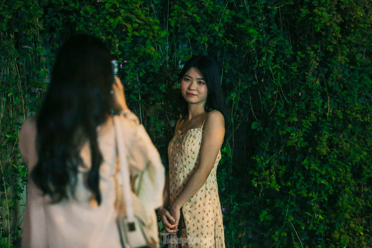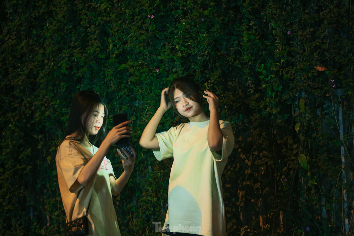 Mặc dù nửa đêm nhưng nhiều người dân vẫn đổ xô đến bức tường với giàn hoa ngũ sắc ở phố Miếu Đầm (quận Nam Từ Liêm, Hà Nội) để chụp ảnh, "sống ảo".