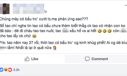 Cô gái trẻ H.P.M chia sẻ trên mạng xã hội như sau: “Các bạn có bầu trước cưới bố mẹ phản ứng sao? Bố mình chỉ nghe tin mình có bầu chưa thèm biết chồng mình có nhận con không đã bảo: “Đẻ đi cháu tao tao nuôi, tao không xấu hổ với ai hết, còn không cho mình lấy chồng chứ”.