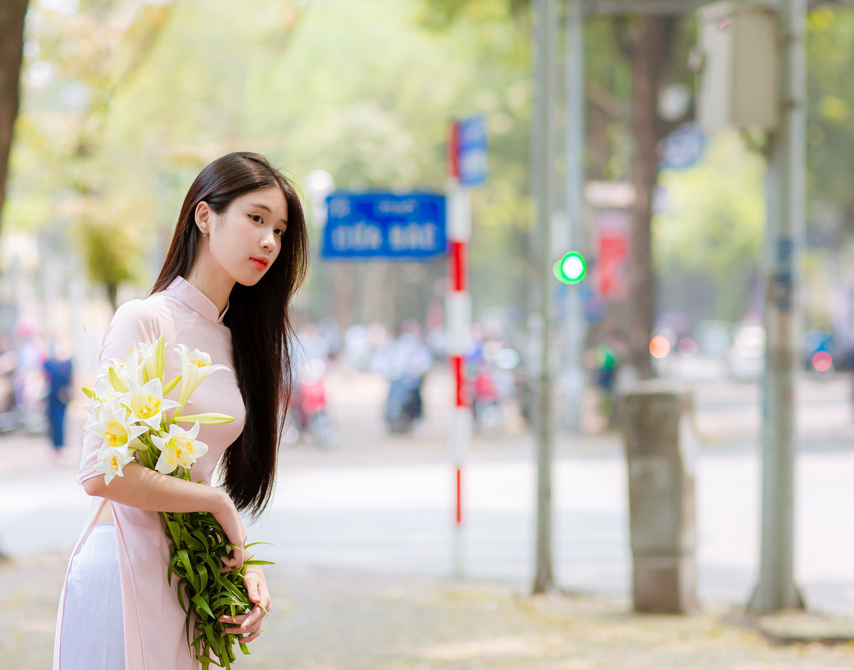 Nét đẹp dịu dàng của người con gái Hà thành bên bó hoa loa kèn trắng tinh khôi, tỏa hương thơm dịu dàng.