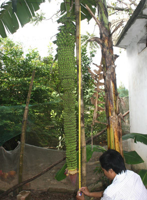 Cây chuối nhà anh Lê Văn Sơn hiện đã trổ buồng được 186 nải chuối, chiều dài gần 2m, mỗi nải khoảng 15 đến 20 quả.