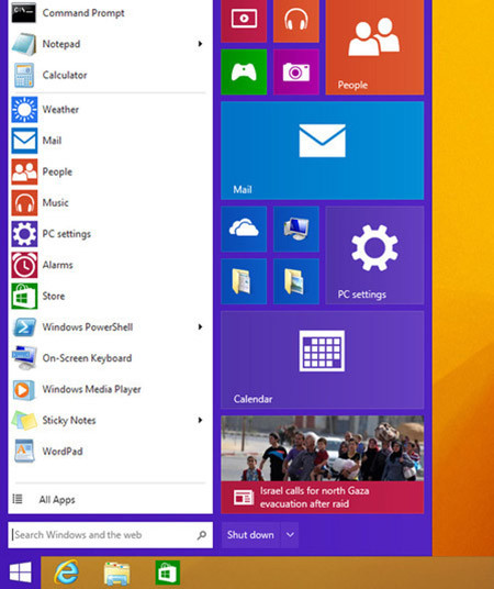 Đây chính là hình ảnh của thanh Start trong Windows 9 sắp ra mắt. Microsoft cho biết bản cập nhật sẽ cho phép các ứng dụng hiện đại chạy trong cửa sổ riêng.