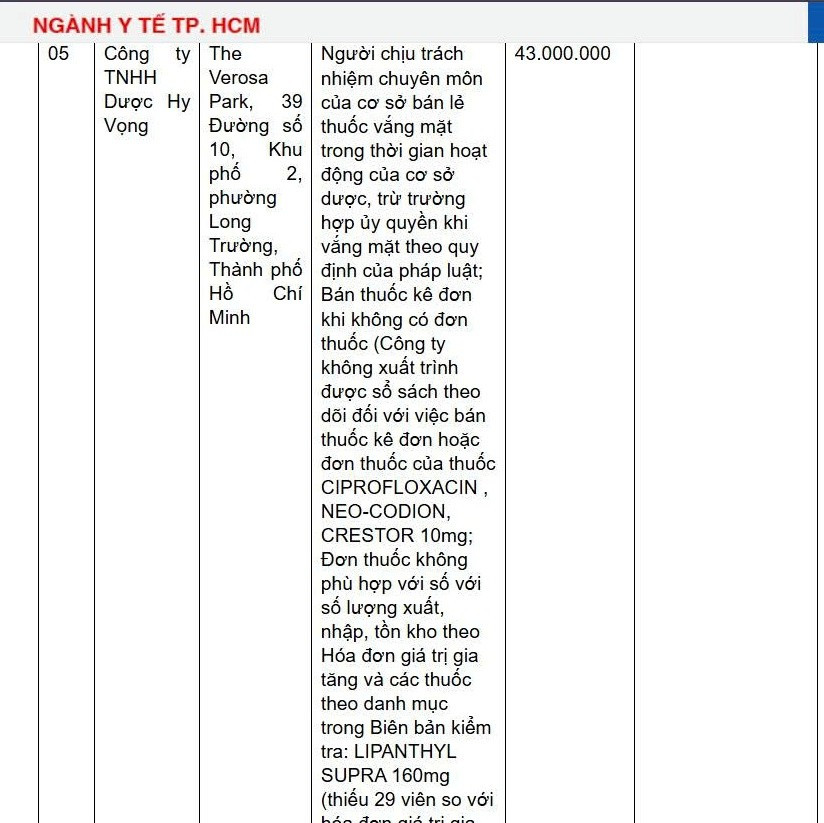 Bị xử phạt đợt này còn có Công ty TNHH Dược Hy Vọng (The Verosa Park, 39 Đường số 10, Khu phố 2, phường Long Trường, Thành phố Hồ Chí Minh).