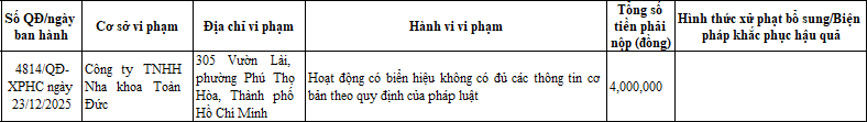 Công ty TNHH Nha khoa Toàn Đức (địa chỉ 305 Vườn Lài, phường Phú Thọ Hòa, TP HCM) bị Sở Y tế TP HCM xử phạt 4 triệu đồng theo Quyết định số 4814/QĐ-XPHC ngày 23/12/2025, do hoạt động có biển hiệu không có đủ các thông tin cơ bản theo quy định của pháp luật.