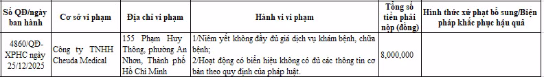 Công ty TNHH Cheuda Medical (địa chỉ 155 Phạm Huy Thông, phường An Nhơn, TP HCM) bị Sở Y tế TP HCM xử phạt 8 triệu đồng theo Quyết định số 4860/QĐ-XPHC ngày 25/12/2025 do niêm yết không đầy đủ giá dịch vụ khám bệnh, chữa bệnh; hoạt động có biển hiệu không có đủ các thông tin cơ bản theo quy định của pháp luật.