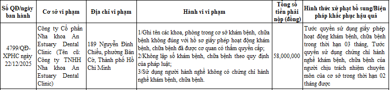 Trong đó, Công ty Cổ phần Nha khoa An Estuary Dental Clinic (tên cũ là Công ty TNHH Nha khoa An Estuary Dental Clinic), địa chỉ 189 Nguyễn Đình Chiểu, phường Bàn Cờ, TP HCM bị xử phạt hành chính số tiền 58 triệu đồng theo Quyết định số 4799/QĐ-XPHC ngày 22/12/2025. Ngoài ra, công ty này còn bị tước quyền sử dụng giấy phép hoạt động khám bệnh, chữa bệnh trong thời hạn 3 tháng. Tước quyền sử dụng chứng chỉ hành nghề khám bệnh, chữa bệnh của người chịu trách nhiệm chuyên môn của cơ sở trong thời hạn 2 tháng.