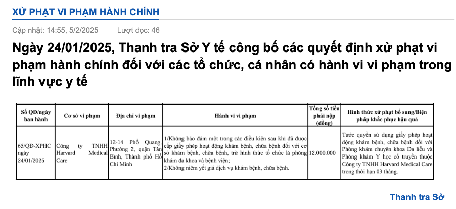 Đáng chú ý trước đó hồi tháng 1/2025, Công ty TNHH Harvard Medical Care bị phạt 12 triệu đồng và tước quyền sử dụng giấy phép hoạt động khám chữa bệnh đối với Phòng khám chuyên khoa Da liễu và Phòng khám Y học cổ truyền thuộc công ty trong thời hạn 3 tháng.