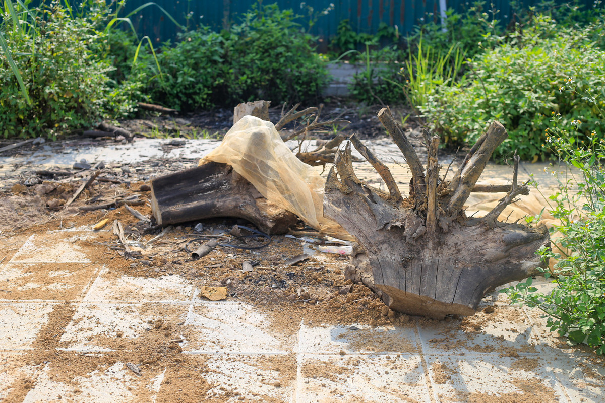 Gốc cây sau khi chặt hạ bị vứt tràn lan trên vỉa hè, nhiều ngày không có đơn vị liên quan đến xử lý.