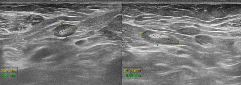 Trên siêu âm tuyến vú cho thấy hình ảnh nhân tuyến vú trái (BIRADS 5), kèm hạch hố nách hai bên.