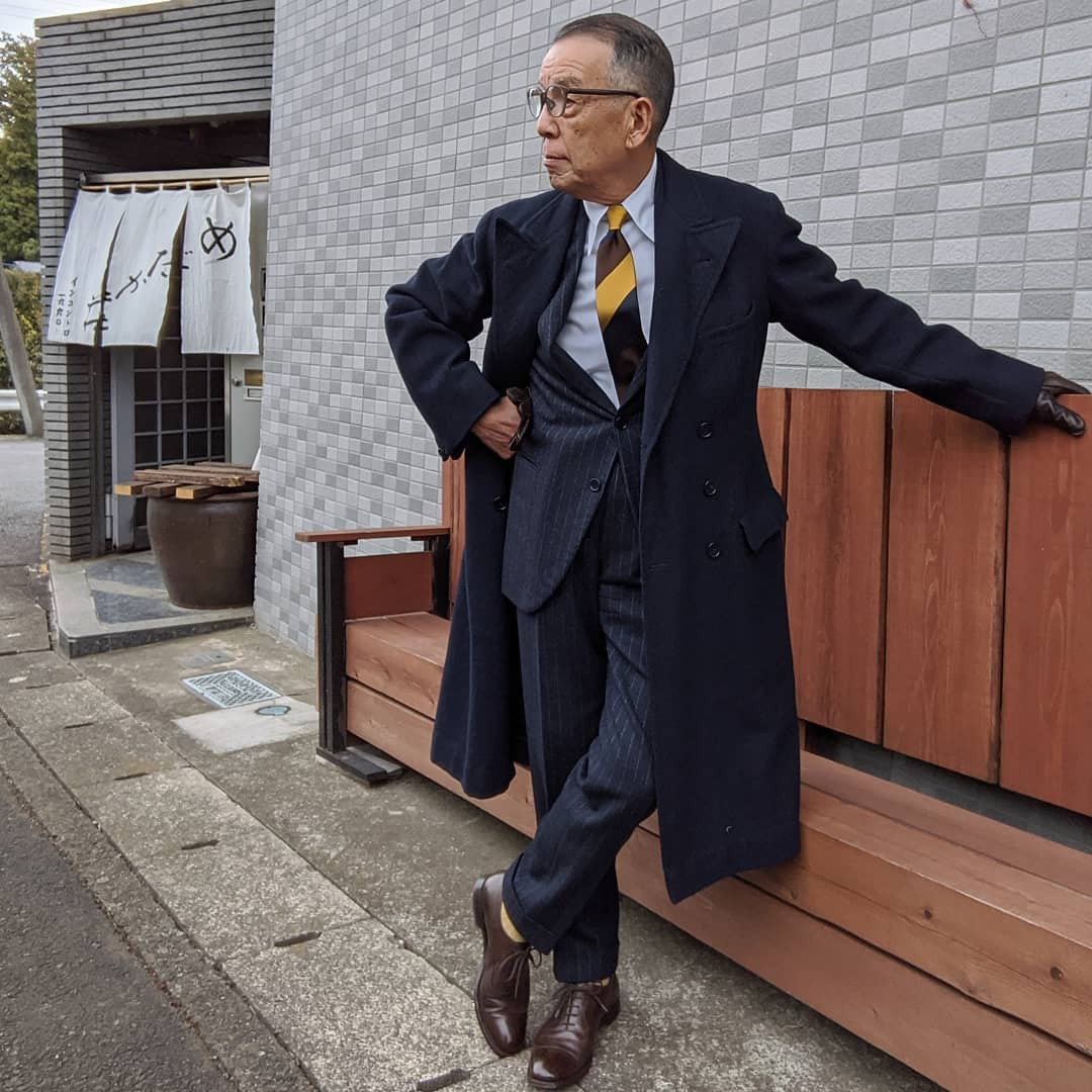 Giày da và những đôi tất cao cổ là phụ kiện không thể thiếu khi mặc suit của ông Akamine. Trong khi đó, cách chọn màu sắc của áo khoác giúp ông nhìn lịch lãm, quyền lực. Ảnh: @akamineyukio.