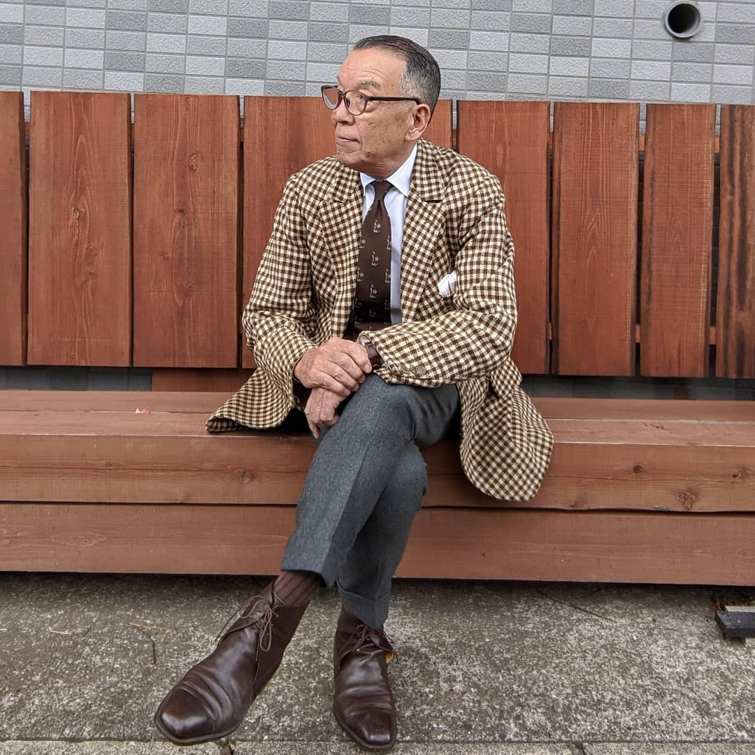 Quần áo của ông Yukio Akamine có phom dáng và kiểu cắt may cổ điển. Ngoài ra, ông còn thường xuất hiện bên họa tiết kẻ sọc, mang lại hiệu ứng trẻ trung hơn tuổi. Ảnh: @akamineyukio.