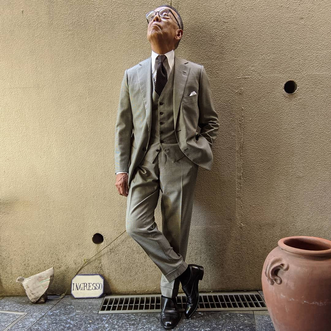 Suit 3 mảnh là trang phục gắn liền với tên tuổi của ông Yukio Akamine. Thiết kế thể hiện rõ phong cách hoài cổ nhưng lịch lãm. Ảnh: @akamineyukio.