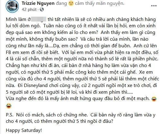 Mới đây, Trizzie Phương Trinh có chia sẻ về cuộc sống đời thường hiện tại. Theo lời vợ cũ Bằng Kiều, do môi trường làm việc tiếp xúc nhiều người nên không ít anh chàng đã để ý, dòm ngó cô.