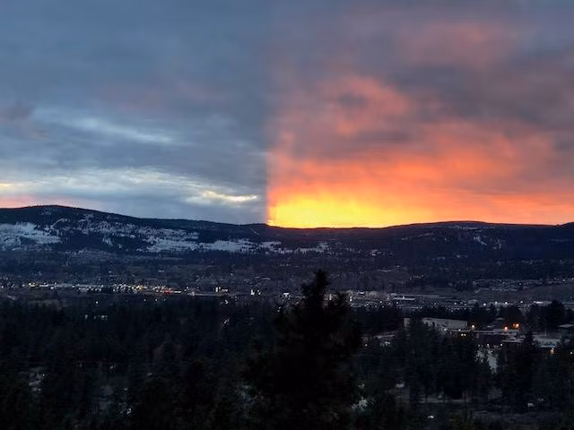 Vào thời khắc hoàng hôn buông xuống, bầu trời Kelowna bỗng nhiên bị chia tách làm hai, giống như hai thế giới âm và dương giao nhau, khiến rất nhiều người không khỏi ngạc nhiên, sửng sốt.