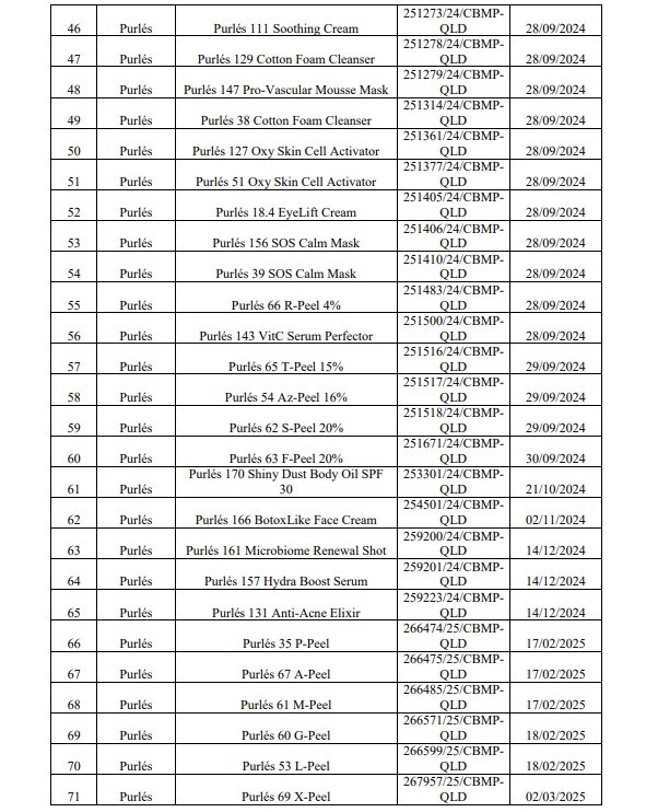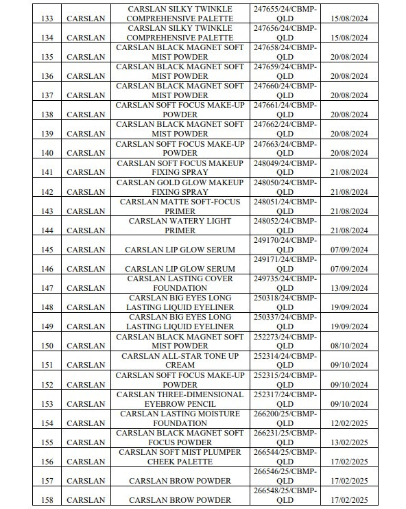 Các sản phẩm bị thu hồi trải rộng ở nhiều nhóm mỹ phẩm như chăm sóc da, trang điểm, làm sạch, chống nắng và các sản phẩm chuyên dụng khác, với thời gian cấp số tiếp nhận từ năm 2022 - 2025.