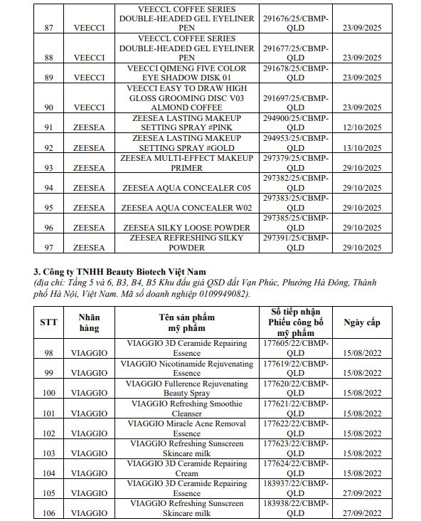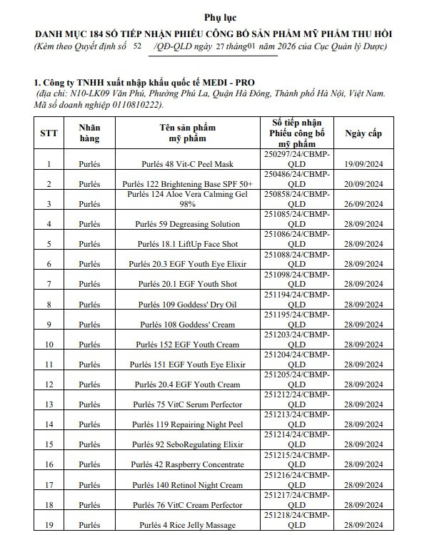 Cục Quản lý Dược (Bộ Y tế) vừa ban hành Quyết định số 52/QĐ-QLD ngày 27/01/2025 về việc thu hồi số tiếp nhận Phiếu công bố sản phẩm mỹ phẩm của các công ty thu hồi tự nguyện: MEDI - PRO, Gấu Tuyết Việt Nam, Beauty Biotech, Khôi Nguyên.