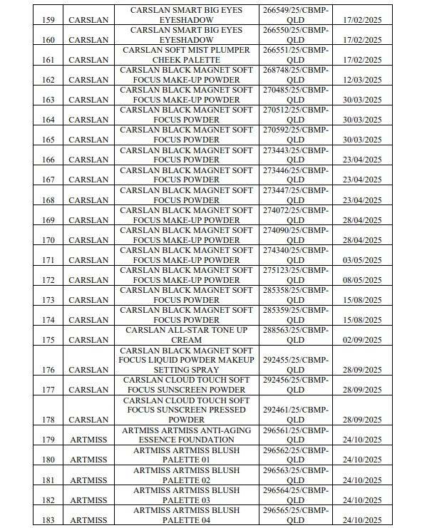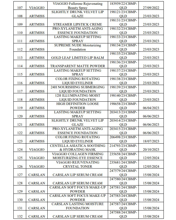 Danh mục 184 số tiếp nhận phiếu công bố sản phẩm mỹ phẩm bị thu hồi kèm theo Quyết định số 52/QĐ-QLD.