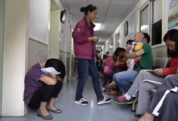 Yan Hongyu, mẹ của Niuniu đang xếp hàng để trả tiền hóa đơn y tế tại Bệnh viện trẻ em Thượng Hải.