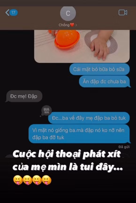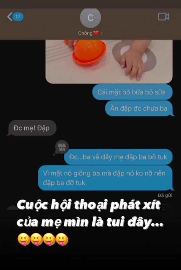 Mới đây, Minh Hằng hé lộ đoạn tin nhắn hài hước của mình và nửa kia. Cặp đôi trò chuyện xoay quanh chuyện con mê chơi bỏ bữa. Minh Hằng chụp ảnh con trai và nhắn với chồng: "Cái mặt bỏ bữa bỏ sữa. Ăn đập được chưa ba?". Ông xã cô hưởng ứng vợ ngay: "Được mẹ! Đập". Thế nhưng, người đẹp lại quay xe cực gắt khi đòi đập chồng vì lí do siêu dễ thương: "Được. Ba về đây mẹ đập ba bỏ tức. Vì mặt nó giống ba, mà đập nó không nỡ nên đập ba đỡ tức".