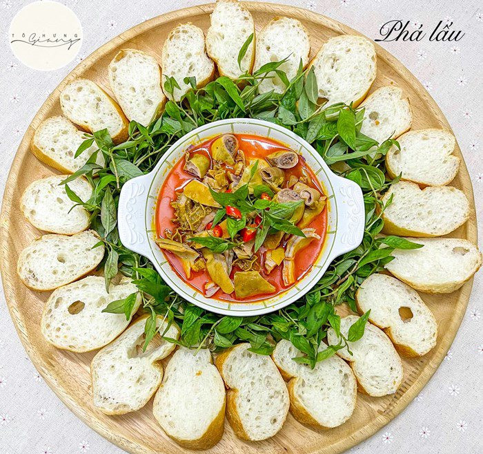 Món này ăn kèm với bánh mỳ, mỳ tôm rất ngon, nên ăn nóng và cũng không thể thiếu rau răm khi ăn kèm.