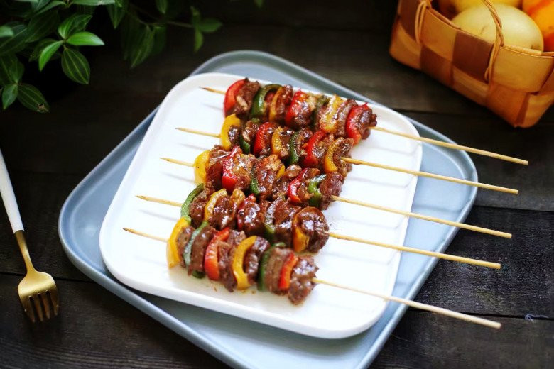 Sau khi thịt ướp xong, đem xiên xen kẽ thịt bò với các loại ớt. Làm lần lượt cho đến hết.