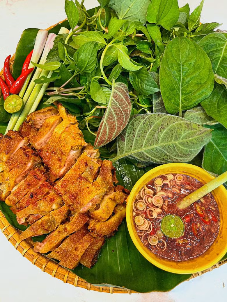 - Vịt chín thái miếng vừa ăn, ăn kèm với nước chấm từ mắm tôm và rau thơm, lá mơ. Vịt nướng giả cầy cũng có thể ăn kèm bún rất hấp dẫn.
