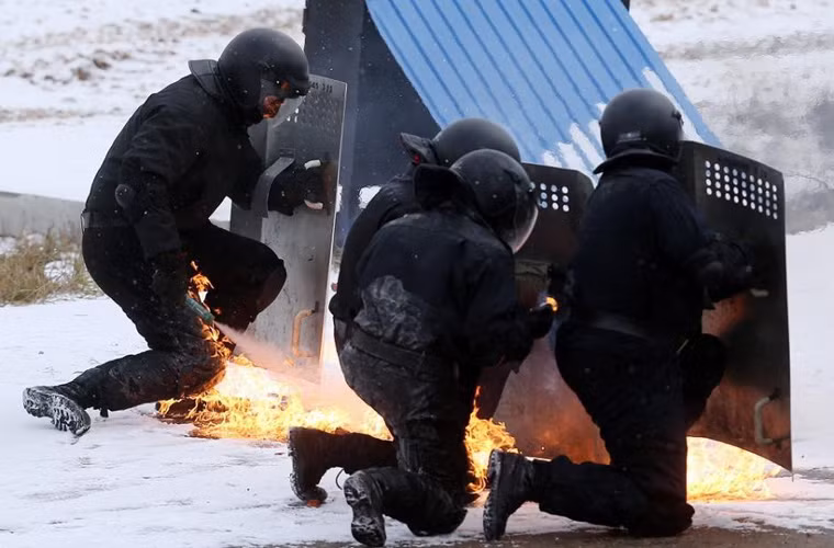 Xử lý tình huống nhân viên an ninh bị lửa bén vào người trong chiến dịch chống bạo động.