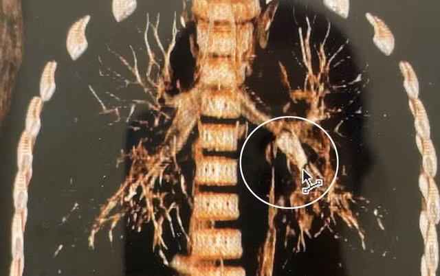 Qua thăm khám lâm sàng, các bác sĩ nghi ngờ trẻ bị hóc dị vật đường hô hấp. Kết quả chụp CT ngực ghi nhận dị vật hình ống, thành dày khoảng 1,8 mm, dài khoảng 18 mm, nằm tại phế quản thùy dưới trái, gây cản trở thông khí.