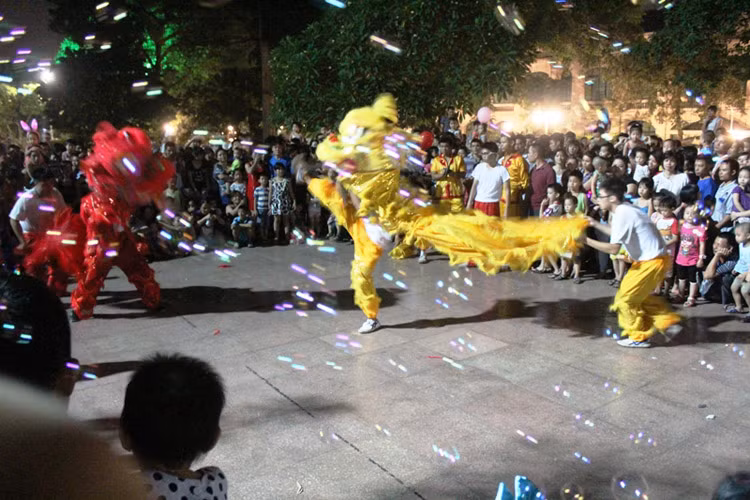 | Rất đông người đi đường vây lại để xem màn biểu diễn múa lân. |