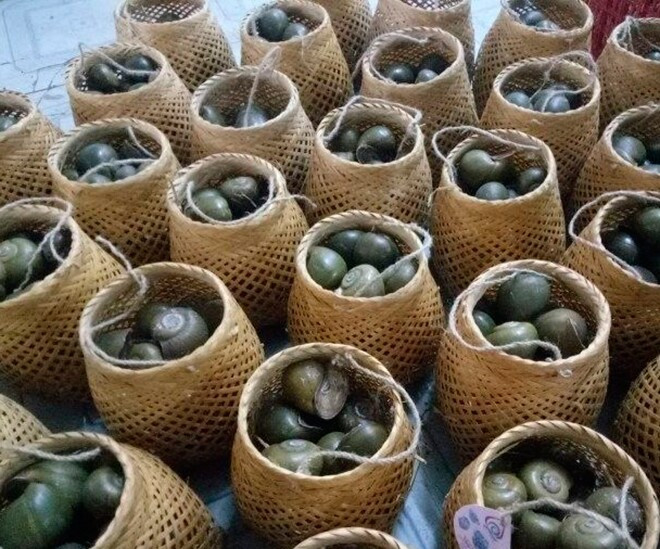 Trên thị trường, ốc gác bếp được đóng trong những cái giỏ xinh xắn, bán với giá từ 200.000-250.000 đồng/kg.