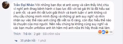 Trước việc bị "ném đá", Đại Nhân bình thản chia sẻ: "Với những bạn đọc status anh xong và cảm thấy khó chịu vì nghĩ anh đang bênh hành vi bạo lực đối với bé gái thì là đã hiểu sai ý anh rồi, và anh thì rất lười giải thích và tranh luận vì anh không có nhu cầu chứng minh mình đúng. Những gì anh suy nghĩ, nhìn nhận sự việc thế nào anh cũng đã viết ra rõ ràng, còn đọc hiểu thế nào là chuyện của mọi người. Nên nếu chúng ta không cùng suy nghĩ và các bạn muốn unfollow anh, không hâm mộ anh nữa thì hãy thoải mái làm".