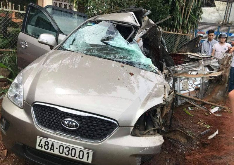 | Ô tô 7 chỗ bị tông bẹp dúm khiến 1 người chết, 4 người bị thương nặng. |