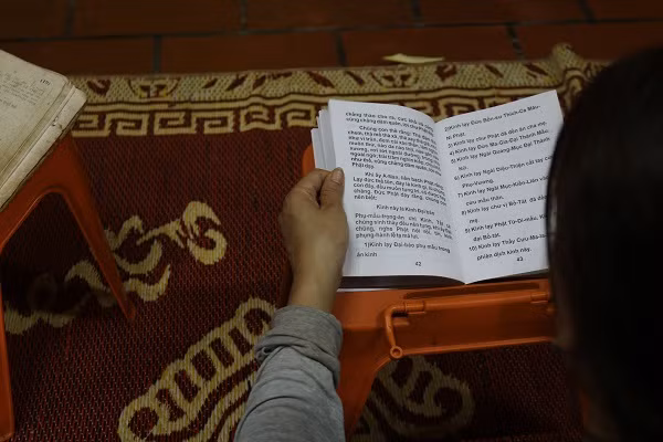 | Một cụ bà đang chăm chú đọc kinh cầu siêu. |
