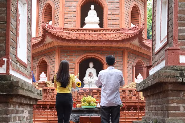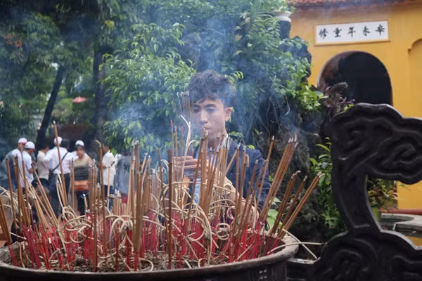 | Lúc 11h trưa, rất đông người dân tới cúng lễ tại chùa Trấn Quốc (Hà Nội). |