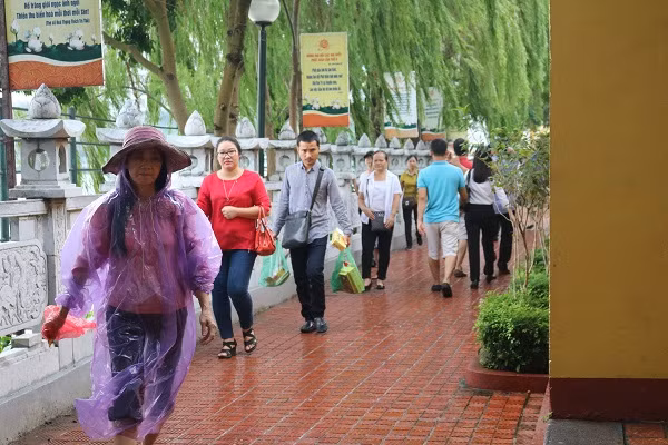| Những cơn mưa bất chợt cũng không làm giảm lượng người tới đây. Phần lớn mọi người không mang nhiều đồ lễ, chủ yếu tới thắp hương và công đức. |