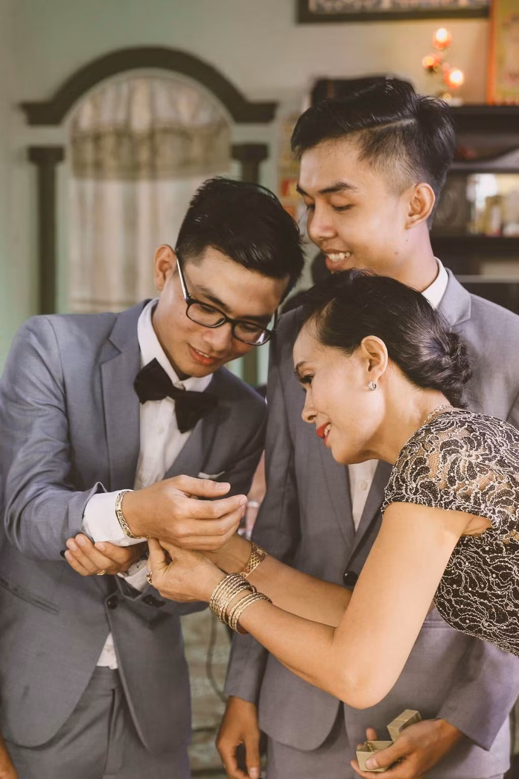 Trước đó, cặp đôi đồng tính này đã nhận được sự quan tâm của cư dân mạng bởi bộ ảnh cưới đặc biệt. Đó là hình ảnh người mẹ của Tuấn Điền dắt hai cậu con trai đi chụp ảnh cưới. Người mẹ ấy đã bỏ công bỏ việc dành thời gian chăm chút cho con từng li từng tí.
