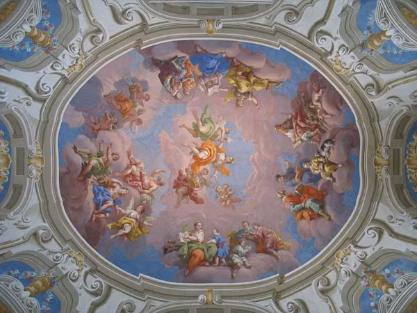 Phía trên bức tường thư viện, những khách tham quan và độc giả có thể chiêm ngưỡng 7 bức tranh tường cổ điển của danh họa Bartolomeo Altomonte.